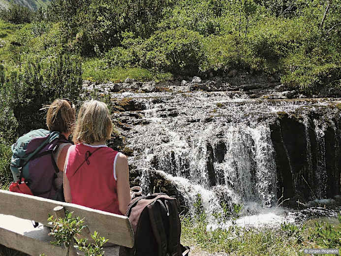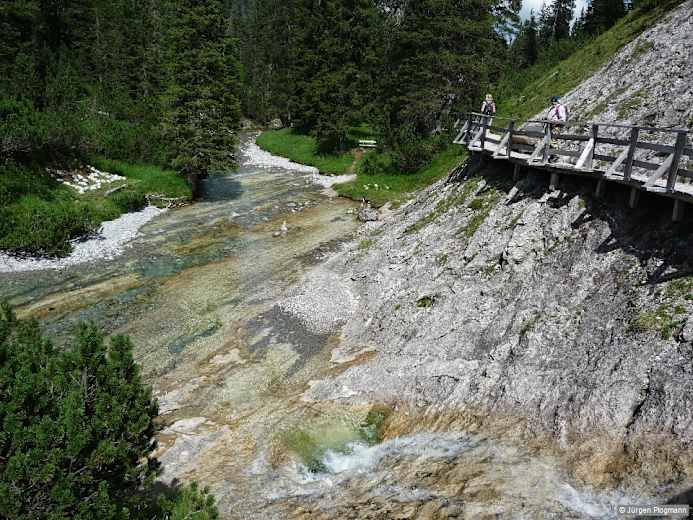 Inzwischen plätschert das klare Wasser des Formarinbachs über viele Steinstufen. Es hat einen geologischen Aufschluss geschaffen, der die Gesteinsschichtungen offen legt. Bereits in der Latschenzone angelangt, bietet sich an einem Wasserfall eine Bank zur Rast an. Nach etwa 70 Minuten wechseln wir über eine Brücke der Mautstraße auf die linke Bachseite (Bushaltestelle) und gelangen in die Waldzone. Zwei große Schuttreißen werden überstiegen, deren Material zu den bemerkenswerten Schotterbänken des Lechs beiträgt und das, letztlich zu Sand zerrieben, im Donaudelta im Schwarzen Meer landen mag.