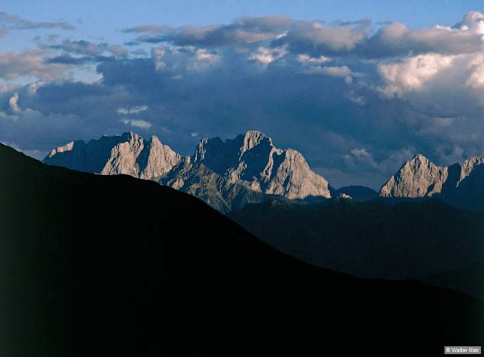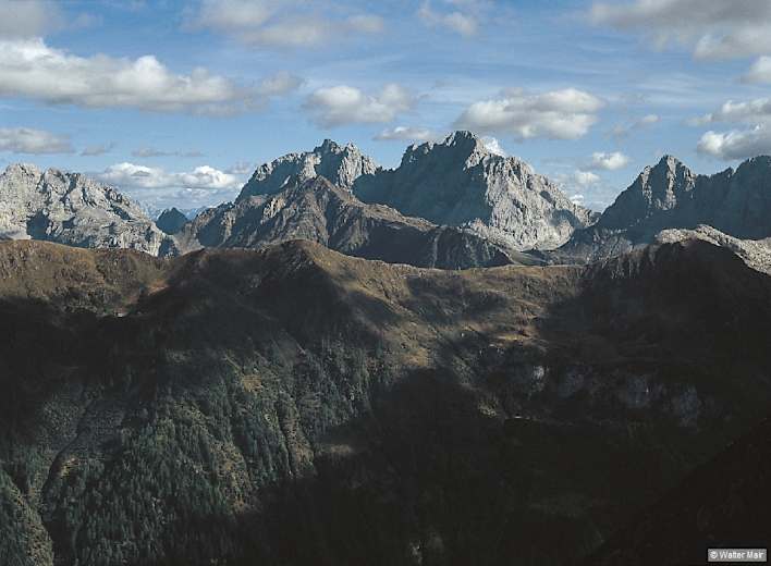 Dem Rauchkofel stehen die Hohe Warte und die Kellerwand mächtig gegenüber. Foto: Walter Mair, Rother Bergverlag