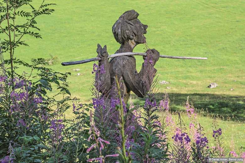 Vom See der Beschilderung zum Restaurant Hilten folgend in zahlreichen Serpentinen aufwärts. Nach Erreichen einer Wegkreuzung auf flachem Weg in gut 10 Min. zum Restaurant Hilten. Links von diesem hinab bis zur Wegkreuzung, wo man wieder auf den bereits bekannten Schnitzlerweg trifft. Hier links halten und kurz vor Ende und dem kleinen Anstieg rechts abzweigen. So geht es in einer kleinen Schlaufe des Schnitzlerweges mit noch mehr Holzfiguren zurück zur Axalp.