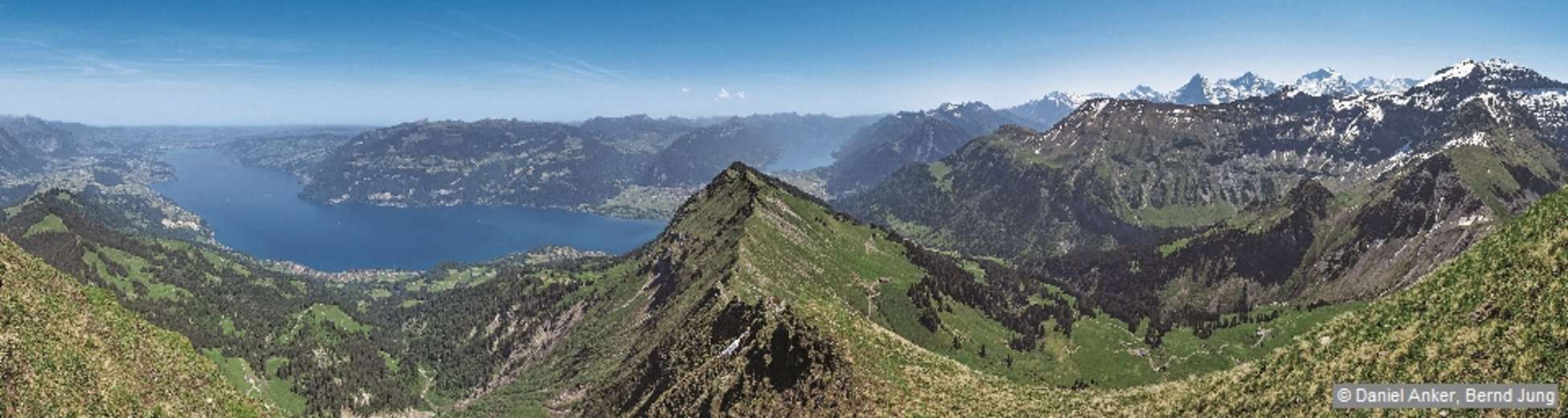 Gipfelpano mit Duo Thuner-/Brienzersee und Trio Eiger-Mönch-Jungfrau. Foto: Daniel Anker und Bernd Jung, Rother Bergverlag