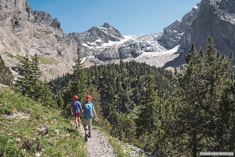 Auf dem Wanderweg zur Engelhornhütte, darüber der Rosenlauigletscher. Foto: Daniel Anker und Bernd Jung, Rother Bergverlag