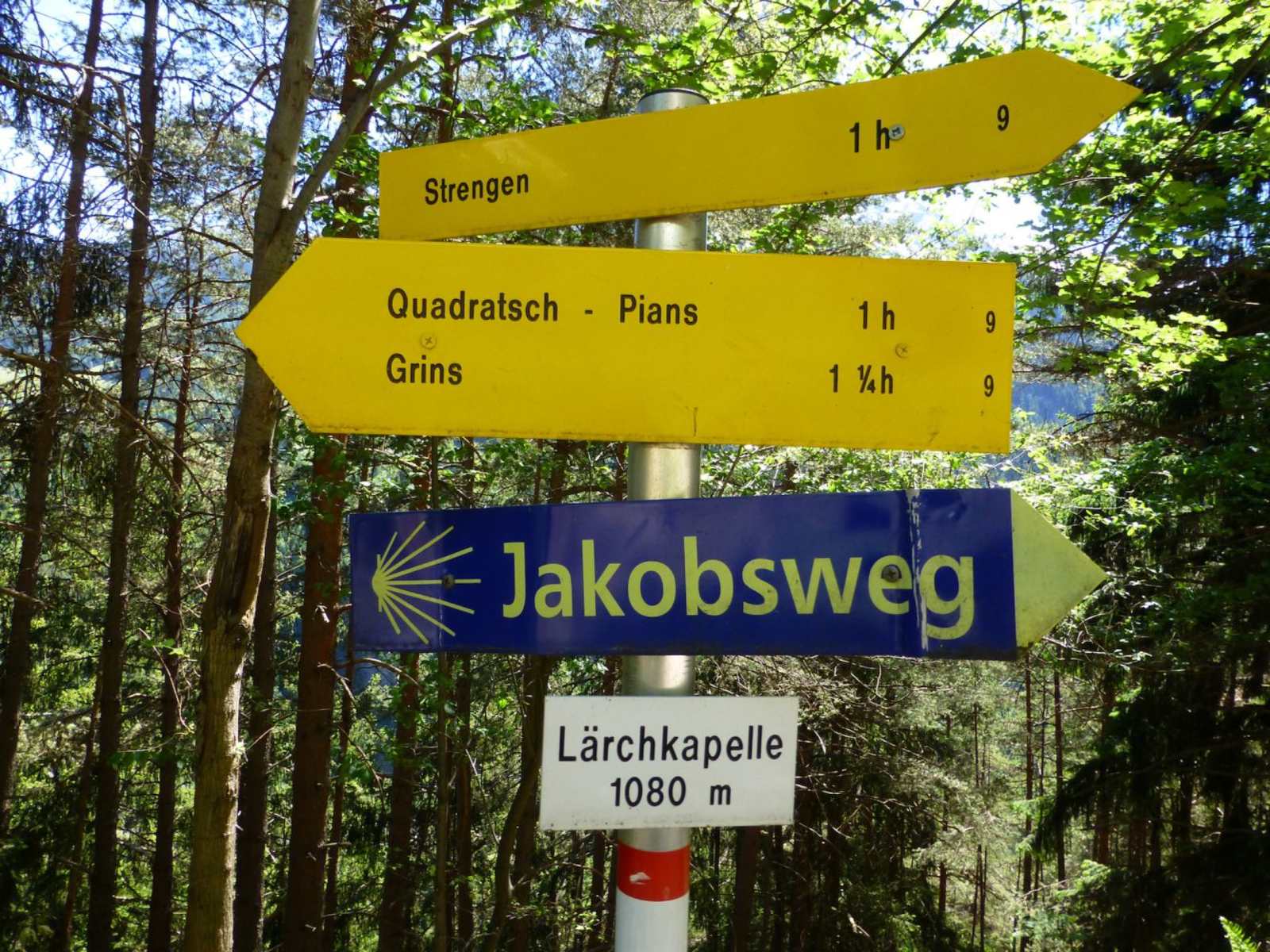 Achtung: Wegsperre im Bereich Pians/Quadratsch mit Wegumleitung (Stand April 2021): Bus Landeck nach St. Anton, Strengen Dorf. Neben der Pfarrkirche und dem Geschäft „Stark“ hinauf zur Lärchenkapelle - hier trifft man wieder auf die Kennzeichnung „Jakobsweg".