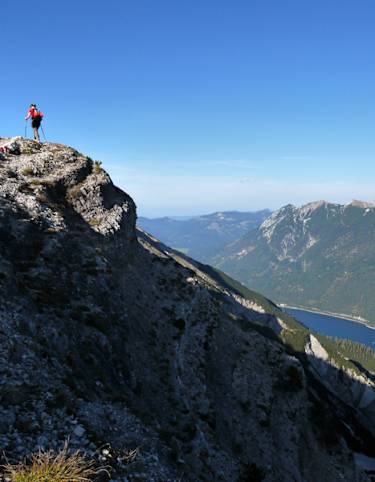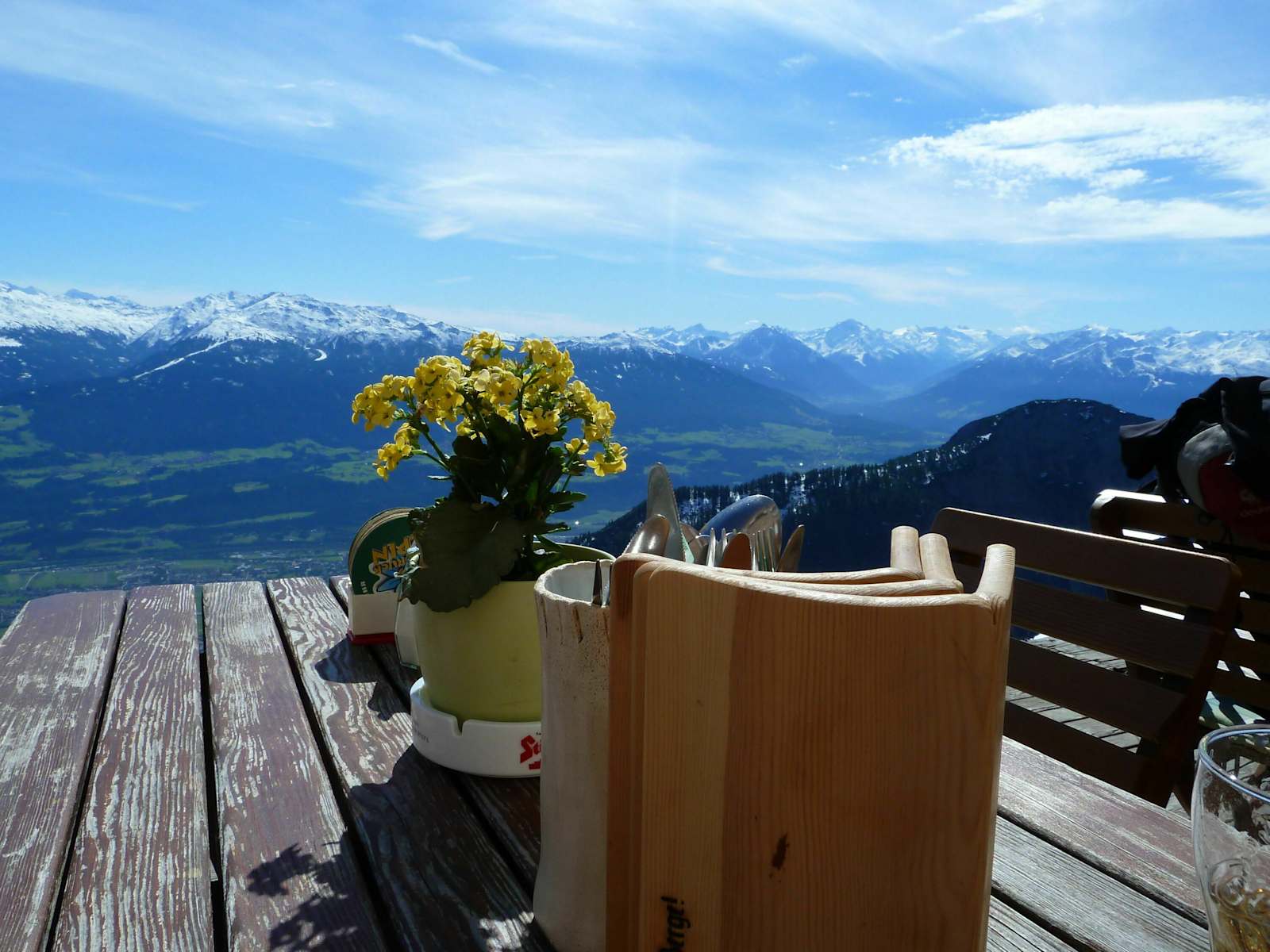 Wo der Weg zum Gr. Bettelwurf abzweigt, sieht man auch bereits die Bettelwurfhütte, die auf einem Absatz unterhalb des Kl. Bettelwurfs steht. Oben auf 2.077 m angekommen, genießt man eine wunderbare Aussicht von der 2016 im Zuge eines keinen Anbaus zur Hütte neu errichteten Terrasse.