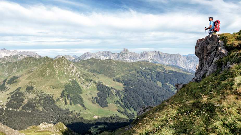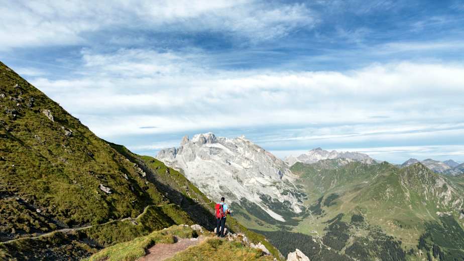 Auch der 9. Tag der Montafoner Hüttenrunde verspricht viele schöne Aussichten, etwa vom Schwarnzhornsattel oder auf der Wanderung entlang des Bikengrates. Die imposanten Kalkgipfel des Rätikon heben sich von den saftig grünen Alpwiesen markant ab. Ziel ist die Lindauer Hütte im Gauertal.