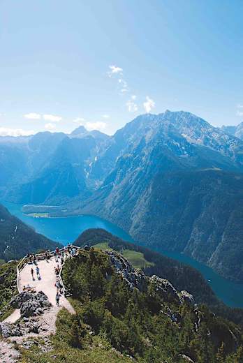 An der Gabelung folgen wir dem Wegweiser Richtung Jenner und Stahlhaus durch freies Almgelände nach links. Der weitere Weg ist nun stark begangen, da viele Wanderer von der Mittelstation der Jennerbahn herüberkommen oder von der Bergstation absteigen. An der Abzweigung ein paar Minuten später halten wir uns rechts, kurz darauf links. Der Fahrweg zieht nun durch Wald, an einer Abzweigung zur Königstalalm vorbei, weiter hinauf bis zur nächsten beschilderten Abzweigung. Wer nicht auf den Jenner möchte, kann hier geradeaus in 45 Minuten über das Schneibsteinhaus zum Stahlhaus gehen. Zum Jenner folgen wir dem Steig nach links über den freien Hang in Serpentinen hinauf. Wir erreichen zuerst die Bergstation der Jennerbahn, 1.802 m, und linkshaltend 15 Minuten später den Gipfel des Jenners, 1.874 m. Hier haben wir eine fantastische Aussicht: Hochkönig, Steinernes Meer, Watzmann, Reiteralpe und Untersberg breiten sich vor uns aus und tief unter uns liegt der Königssee.