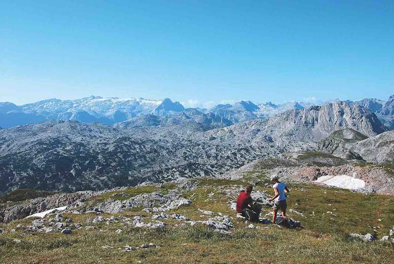 Vom Stahlhaus folgen wir dem Schild Richtung Schneibstein und Seeleinsee auf markiertem Weg nach Südosten. Erst steigen wir durch Latschen, dann über Geröll und schließlich über felsdurchsetzte Bergwiesen hinauf auf die flache Kuppe des Schneibsteins, 2.276 m, mit den zwei Gipfelkreuzen. Von hier haben wir einen herrlichen Rundblick auf Hagengebirge, Hochkönig, Steinernes Meer, Watzmann, Reiteralpe, Göllstock, Tennengebirge und Dachstein.