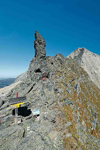 Die Friesenbergscharte wird von einem spitzen Felszacken flankiert. Foto: Mark Zahel, Rother Bergverlag