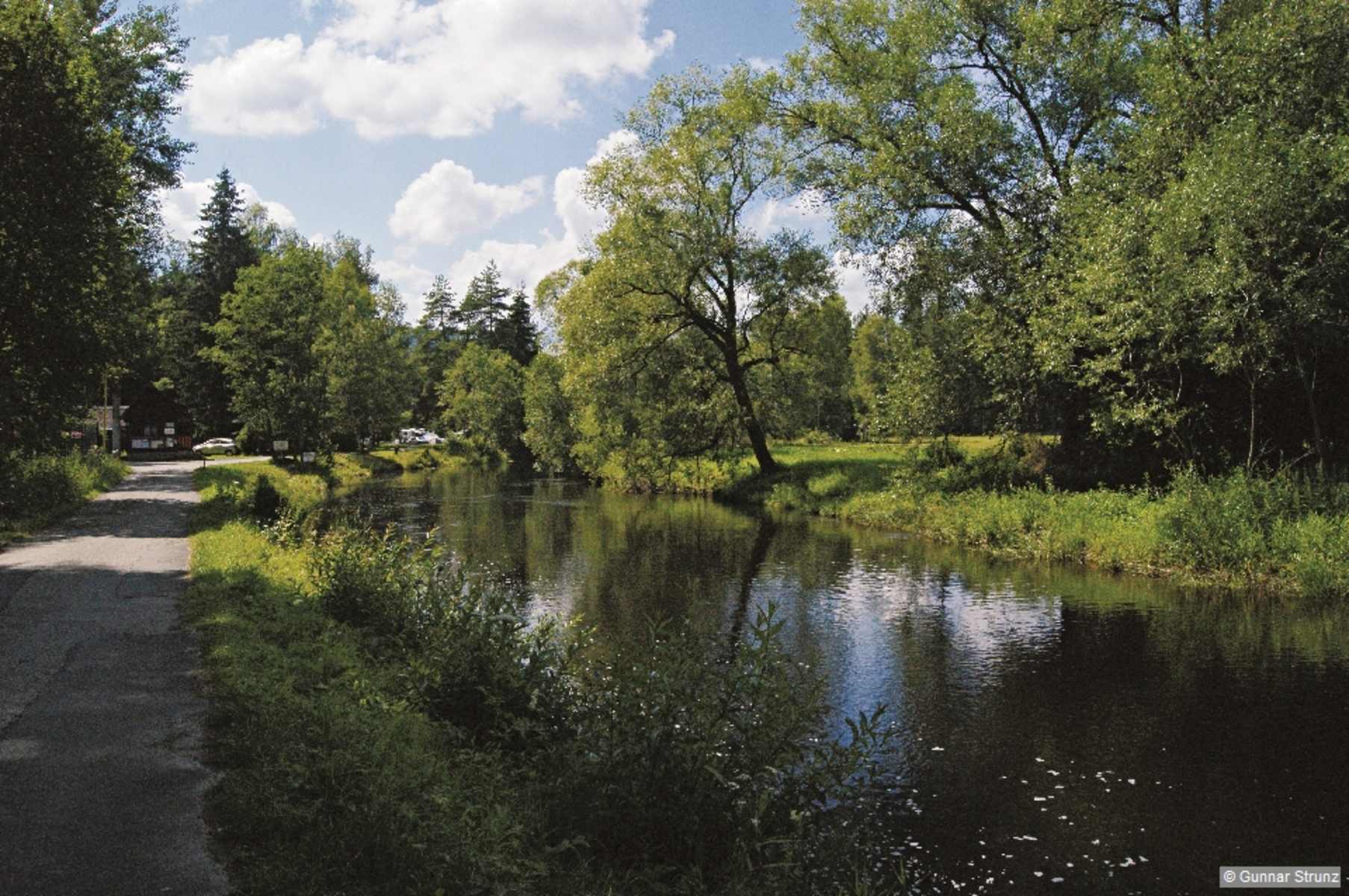 Der Weg führt weiter durch den Campingplatz, doch bald stehen wir an der Moldau, wo sich das Flusstal in wirklich einzigartiger Schönheit zeigt. Der Weg verändert sich rasch zum »wildromantischen« Waldpfad. Links sehen wir einen Bunker. In dieser Gegend trifft man mehrmals auf solche Bunker. Sie wurden in den 1930er-Jahren als Verteidigungsanlagen erbaut; in der damaligen Tschechoslowakei fürchtete man in den grenznahen Regionen den Einfall der deutschen Wehrmacht – was ja dann im September 1938 nach dem Münchner Abkommen mit kampfloser Landnahme auch geschah. Alsbald passieren wir die Stelle, wo der Moorlehrpfad aus Richtung Aussichtssturm einmündet.