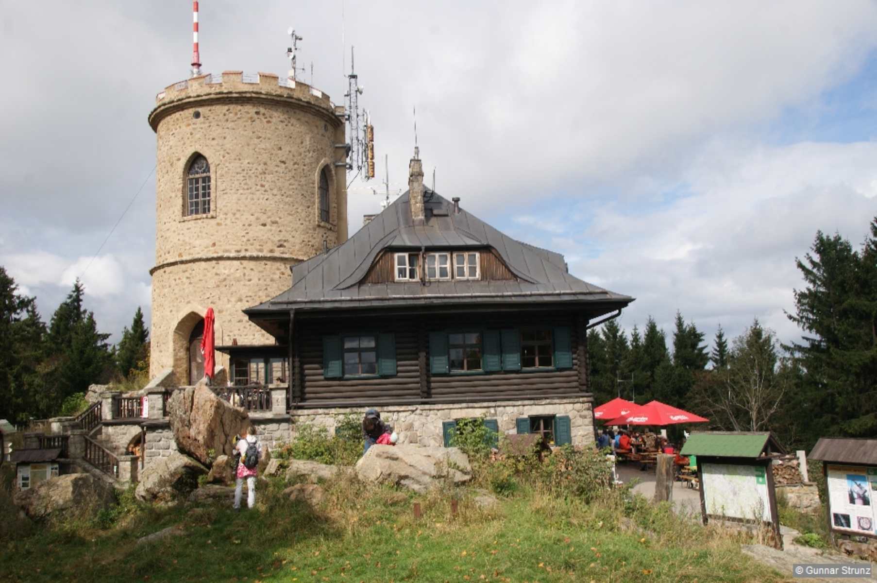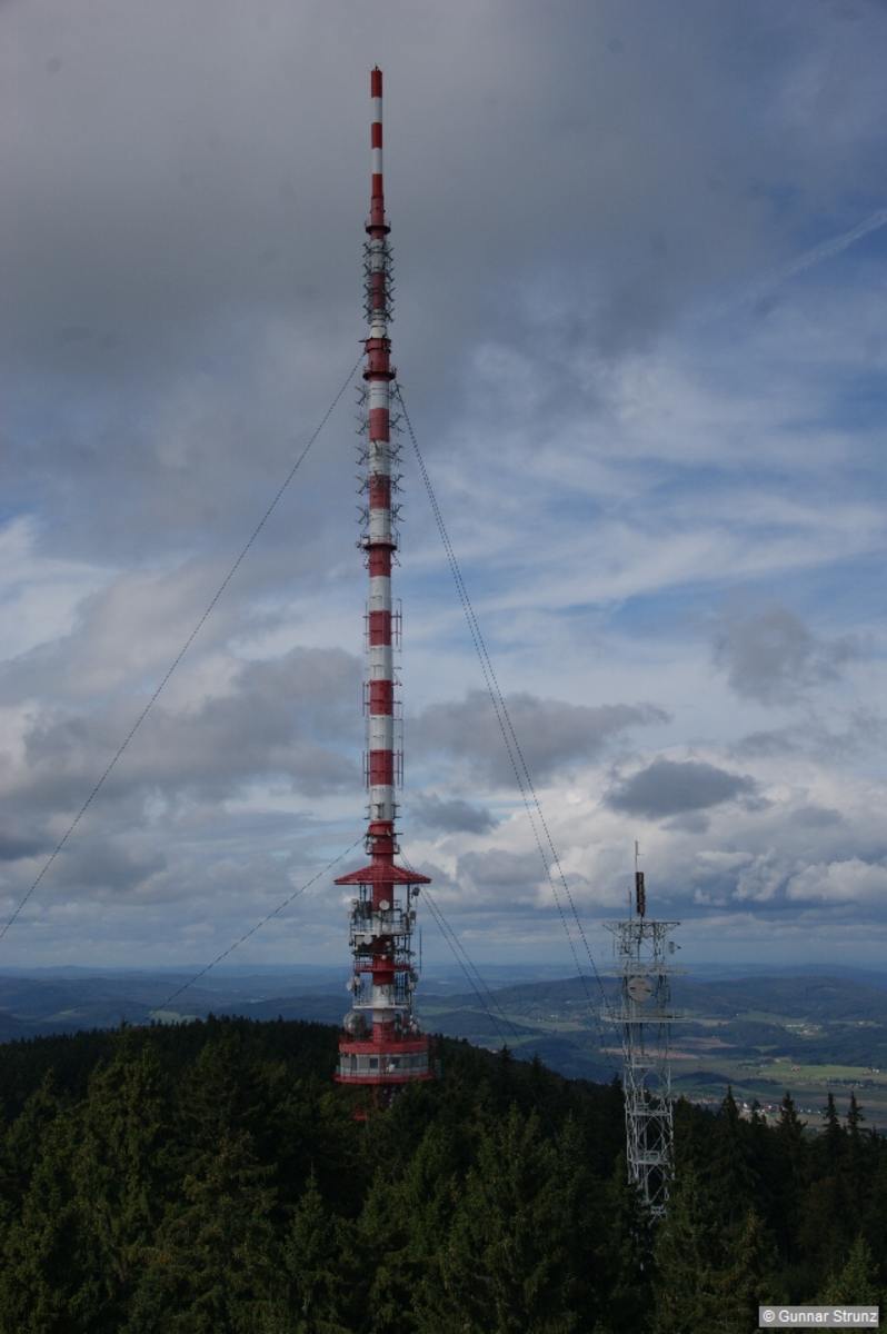Der 1825 erbaute Aussichtsturm (er ist damit der älteste in Böhmen aus Stein) bietet eine der schönsten Fernsichten über das Land. Der Blick schweift von Plöckenstein und Dreisesselberg über das Moldautal zu den Hügeln des Truppenübungsplatzes Boletice, streift die Fernmeldeanlagen des Blanský les und reicht bis hinab ins Tiefland; in der Ferne ragt das Kernkraftwerk Temelín auf, dann streift unser Blick Budweis und zieht sich über das Kloster Goldenkron bis nach Český Krumlov herum, von dem gerade noch die Spitze des Schlossturms zu sehen ist.