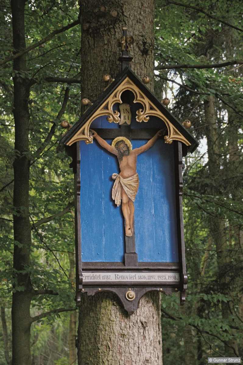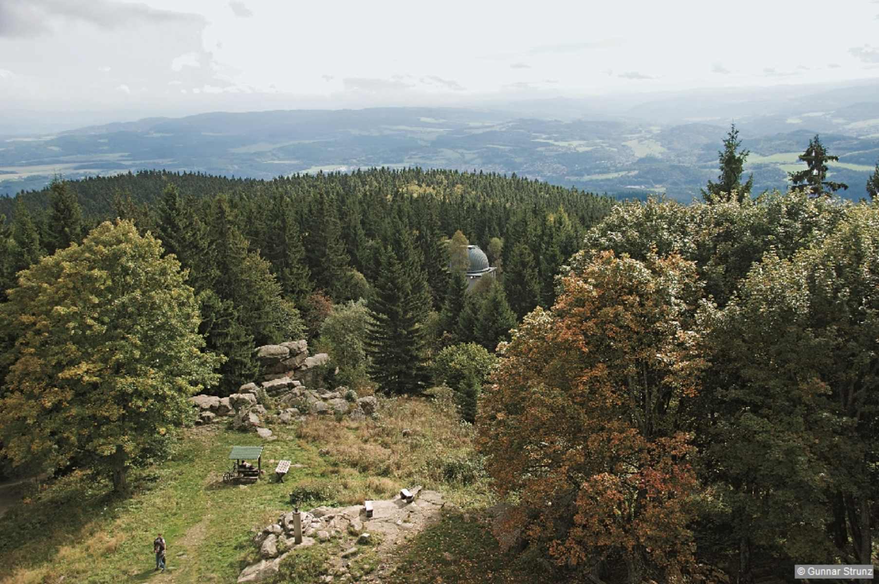 Wegweiser empor zum Klet’. Foto: Gunnar Strunz, Rother Bergverlag Die höchste Erhebung des Böhmerwalds ist der Kleť . Foto: Gunnar Strunz, Rother Bergverlag Vom Turm auf dem Kleť blickt man südwärts über eine kleine Sternwarte weit ins Vorland des Böhmerwalds. Foto: Gunnar Strunz, Rother Bergverlag Unendlich weit erscheint die Aussicht vom Klet’ aus. Foto: Gunnar Strunz, Rother Bergverlag Fernmeldeturm nahe des Berggipfels. Foto: Gunnar Strunz, Rother Bergverlag Christus am Kreuz am Punkt U Modréhu obrazu. Foto: Gunnar Strunz, Rother Bergverlag Bildergalerie (6)