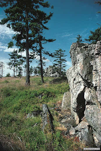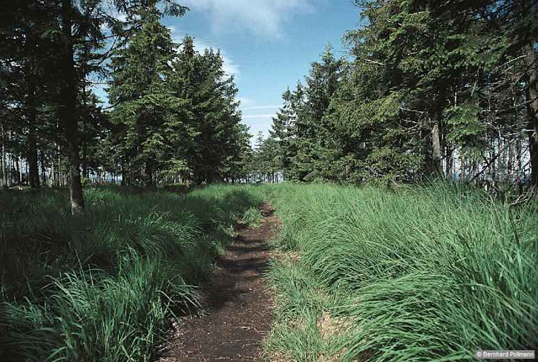 Oberhalb der Schutzhütte folgt die X-Markierung des E 6 dem Forstweg Ackerstraße über die vom Waldsterben mitgenommene Acker-Kuppe und schwingt dann in den aussichtsreichen Hang über dem Siebertal ein. Die Bezeichnung Acker hat nichts mit Feldwirtschaft zu tun, sondern leitet sich vom mittelhochdeutschen Wort „agger“ ab, was so viel wie Kamm bedeutet. Nach dem weitflächigen Absterben standortfremder Fichten haben sich Pionierbäume wie Ebereschen und Birken angesiedelt; vom Wegrand fällt der Blick anfangs auch in die Moore, die sich auf dem Acker gebildet haben: Sie dürfen ebenso wenig betreten werden wie der spannende historische Fastweg, über dessen Bedeutung eine Lehrtafel informiert.