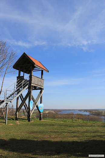 Von der Schleuse in bisheriger Richtung weiter, über die Stecknitz, dann über die Abzweigung der Hermann-Gebauer-Straße wieder zurück zu B 5 und am Rand des Industriegeländes weiter. Dann zweigt rechts bzw. südwärts ein Fahrweg ab, der uns in die Elbtalaue bringt. Vor der Elbe treffen wir bei einer Infotafel zum NSG Lauenburger Elbvorland und Ruhebank auf einen Quer-Fahrweg, hier links. Bei zwei Schranken erreichen wir die Grenze zu Mecklenburg-Vorpommern. Dahinter steigen wir zum Deich hinauf und laufen auf diesem parallel zur Elbe weiter. Zweimal biegt der Weg etwas nach rechts um, dann vor einem Wassergraben nach links; so führt er zu einem Wasserschöpfwerk. Noch ein paar Schritte in bisheriger Richtung, dann rechts mithilfe einer Brücke über den Wassergraben, kurz rechts zurück und per Linkskurve in den Wald. Der nun breitere Sandweg ist manchmal etwas mühsam, Abzweigungen zur B 5 ignorieren wir und laufen immer geradeaus bzw. mit kleinen Schlenkern rund 3 km Richtung Osten. Mitten im Wald zweigt dann vom ehemaligen Kolonnenweg rechts ein abwechslungsreicher Fußweg durch den Elbhang ab. Schon nach wenigen Minuten biegt links ein kurzer Weg zum Köpelberg ab, eine Walderhebung mit beschränktem Elbblick und einfacher Sitzmöglichkeit.