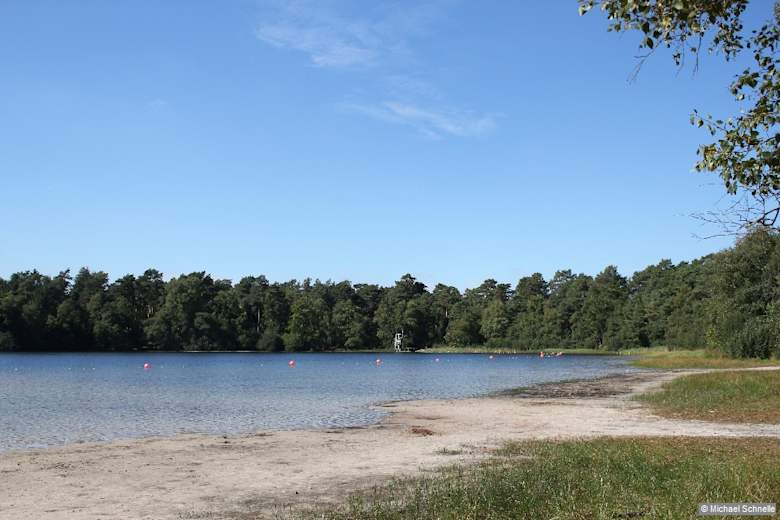 Wir folgen nun rechts dem gesperrten Fahrweg, überqueren geradeaus einen Schotterweg und erreichen dann die Kreuzung mit der Asphaltstraße Am Großen Bullensee. Linker Hand liegt hier ein großer Parkplatz. Geradeaus kommen wir dagegen zu einem Waldspielplatz und zur Badestelle am Großen Bullensee, der als Naherholungsziel sehr beliebt ist.