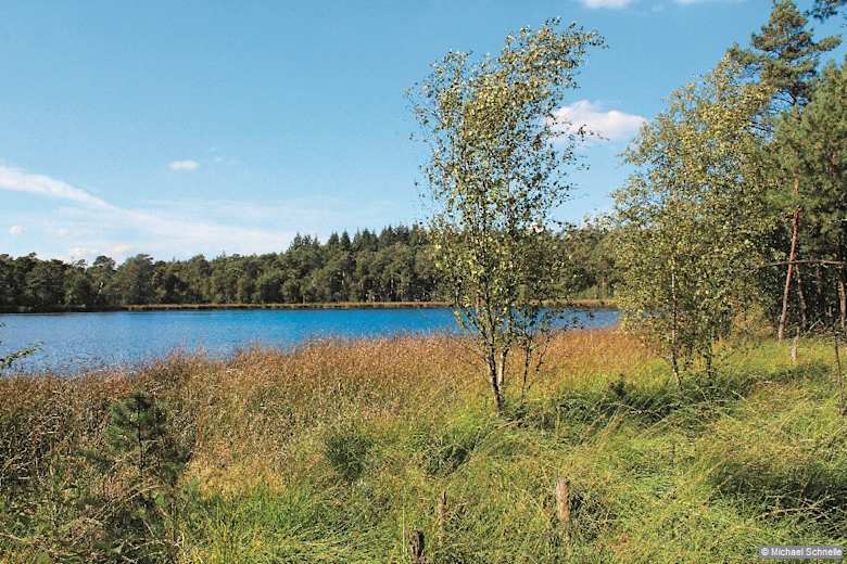 Von der Badestelle laufen wir rechts am Nordufer entlang und kommen zum DLRG-Badeturm. Dort halten wir uns rechts und treffen hinter dem DLRG-Haus auf einen Asphaltweg, dem wir ganz kurz folgen. In einer Linkskurve geht dann rechts ein Fußweg ab, der in das Moorgebiet um den Kleinen Bullensee führt. Vor dem idyllischen Kleinen Bullensee, der zum NSG Großes und Weißes Moor gehört, treffen wir auf einen Querweg, dem wir nach links folgen. So stoßen wir am Rand einer Wochenendsiedlung auf den Quer-Fahrweg Am Kleinen Bullensee. Auf ihm geht es nach rechts weiter. Bald erreichen wir ein Heidegebiet und kommen dort an einem halb überdachten Bienenstock vorbei.
