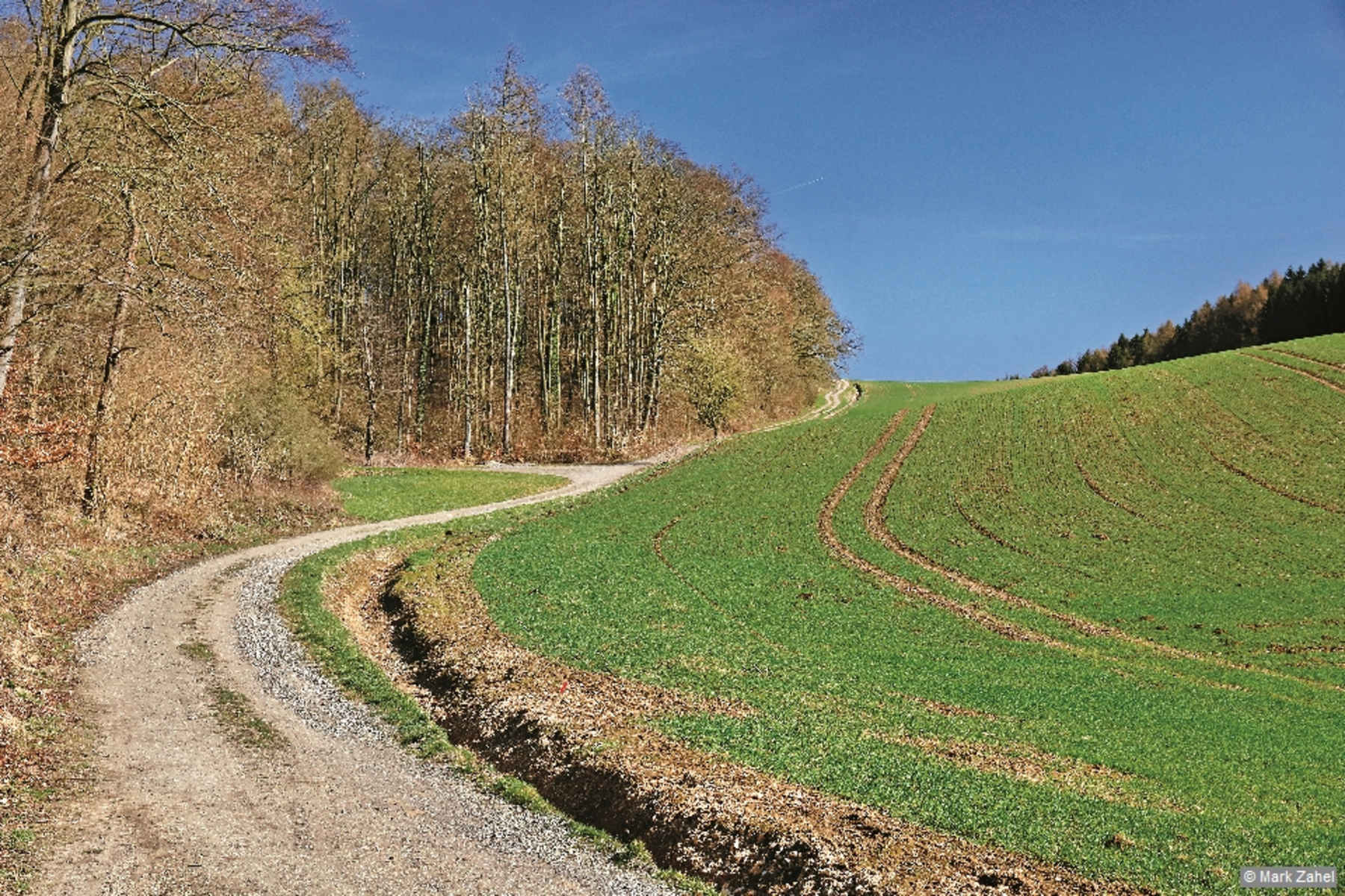 Nach mehr als einer Stunde verlassen wir auf der Osterhasenwiese den E11, halten uns am Waldrand abwärts und gelangen zu einem Parkplatz an der Kreisstraße hinter Hörsum, 168 m. Direkt gegenüber setzt sich die Route ins Hörsumer Tal fort. Nach rund 800 Metern wählen wir den Linksabzweig und wandern über eine schön geschwungene Lichtung, die sich hinter dem Reißel versteckt. Annähernd parallel dazu führt auch ein Weg am Waldrand unterhalb von Lieth und Kratzberg. Die Kuppe der Wolfseiche bleibt ebenso links wie zwei Abzweigungen nach Hörsum – erst bei einer Gegensteigung folgen wir jener zum Kuckuck, ca. 200 m. In diesem kleinen Waldstück Richtung Nordwesten und anschließend direkt oberhalb der Sindelberg-Siedlung entlang.