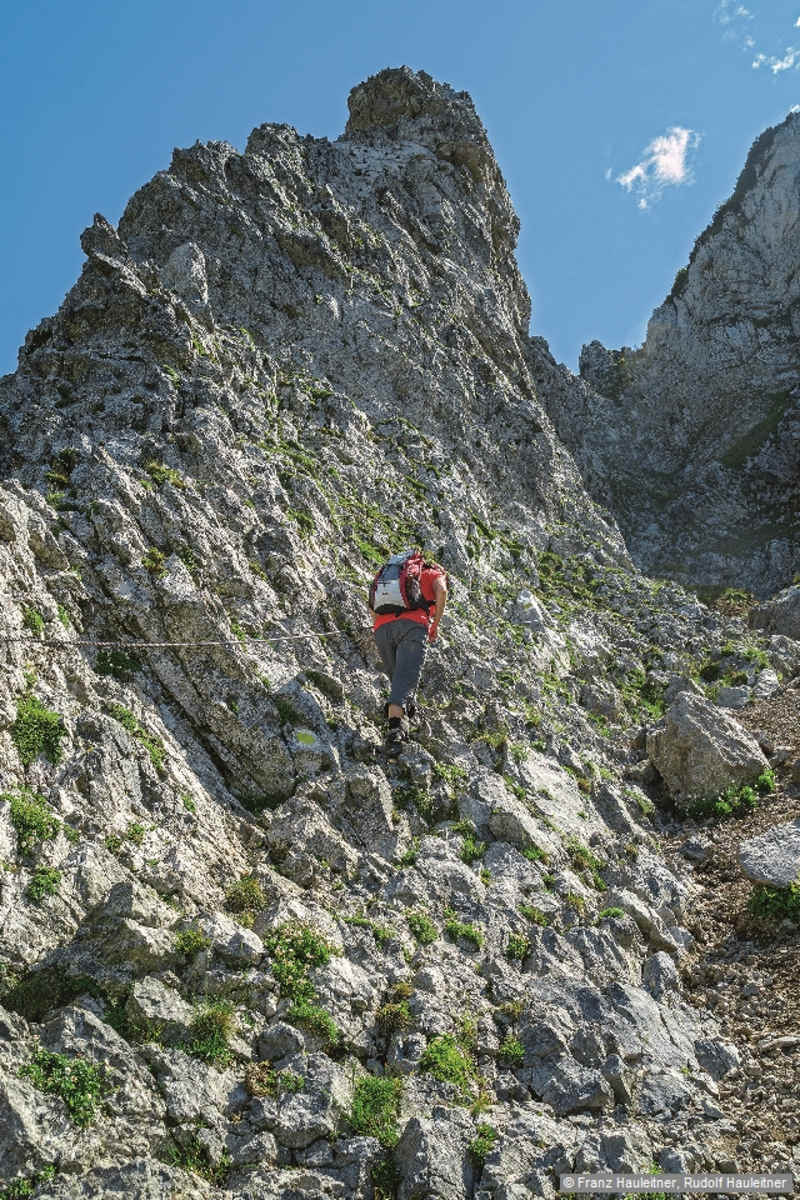 Eine durch Drahtseile gesicherte Felspassage im unteren Bereich des Fadensteigs.Franz Hauleitner, Rudolf Hauleitner Foto: Franz Hauleitner, Rudolf Hauleitner, Rother Bergverlag