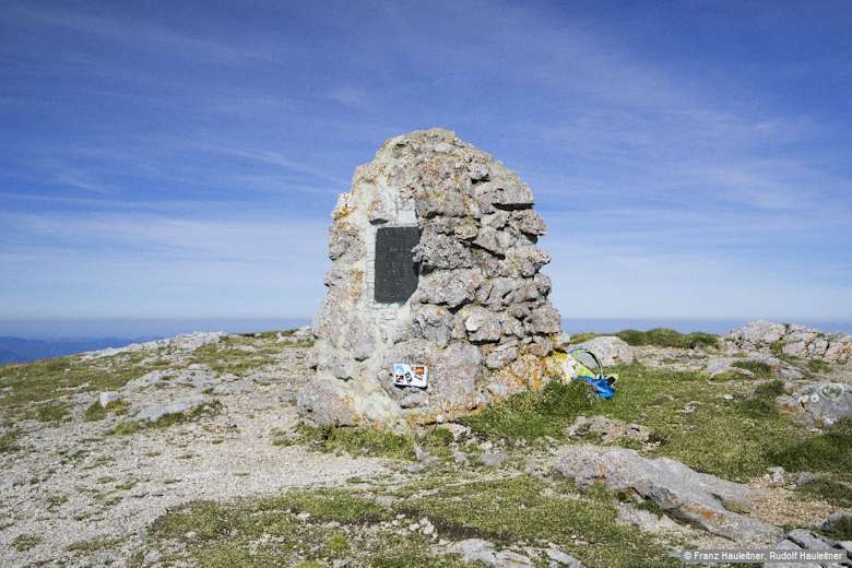 Wieder hinab zur Fischerhütte und über den grasigen Verbindungskamm in einen Sattel, 2.030 m, danach, über den „Mittelgipfel“ hinweg, nach Südwesten zum Klosterwappen, 2.076 m, der höchsten Erhebung des Schneebergs und des gesamten Bundeslandes Niederösterreich. Umfassende Rundsicht, nach Westen bis zum Toten Gebirge!
