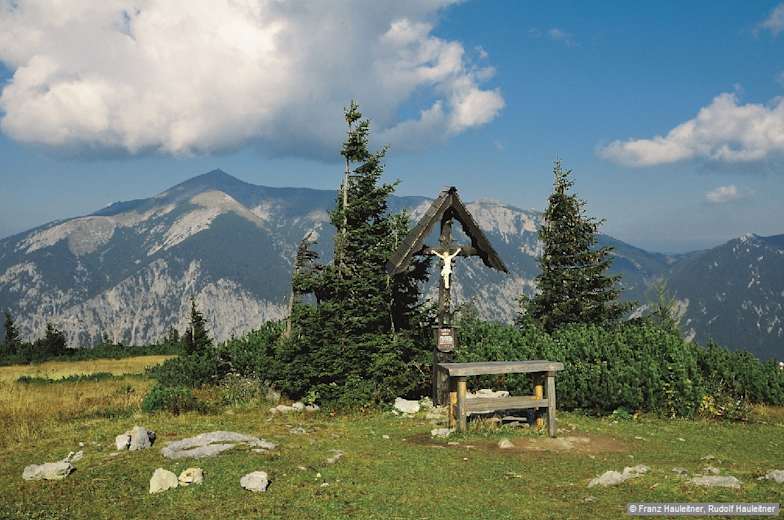 Das Gatterlkreuz am Zugang zum Otto-Haus. Im Hintergrund der Schneeberg. Foto: Franz Hauleitner, Rudolf Hauleitner, Rother Bergverlag