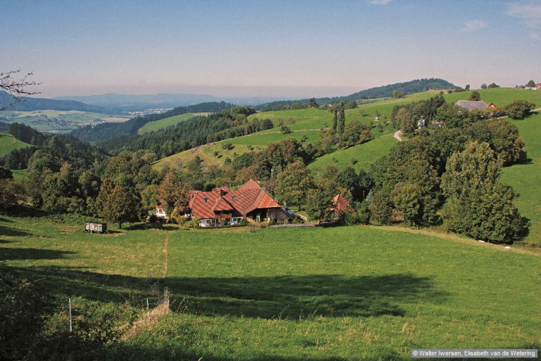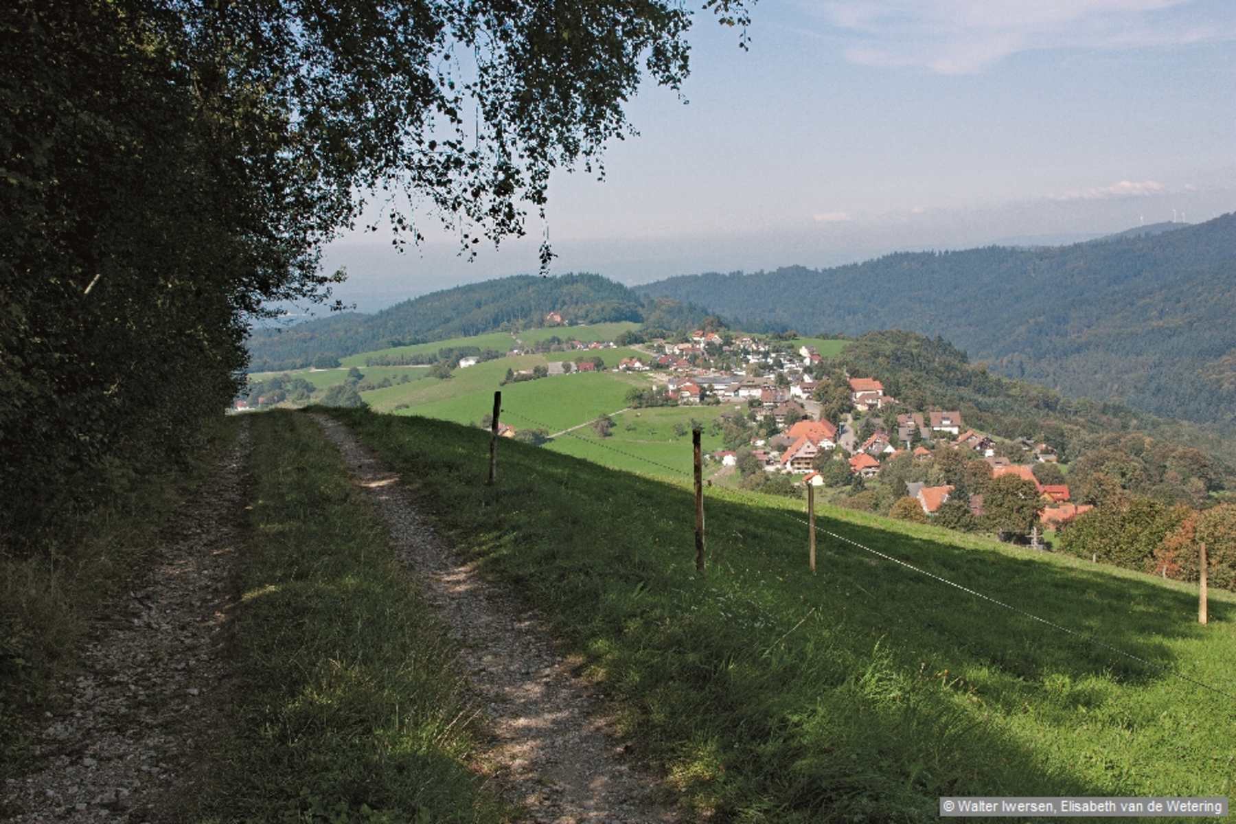 Auf einem Trampelpfad geht es in den Wald hinein bis zum Abzweig rechts am Wegweiser Berggraf Richtung Horben und von dort hangabwärts hinunter zur Gießhübelstraße. Wir folgen der Straße etwa 20 Schritte nach rechts, queren sie und nehmen den Pfad zur Wegverzweigung am Unteren Sailendobel. Wir schwenken auf den scharf nach links abzweigenden Weg Richtung Gießhübel; den geradeaus führenden Weg direkt nach Horben ignorieren wir. Auf der von uns gewählten Route erwartet uns etwas später eine prächtige Aussicht über die Eduardshöhe, die wir uns nicht entgehen lassen wollen. Auf fast ebenem Gelände geht es bis zum Wegweiser Am Kaltwasserwald an einem breiten Forstweg, auf den wir nach rechts Richtung Freiburg abbiegen. Wenig später beginnt eine schöne Panoramastrecke, die uns über die Stationen Kaltwasser, Eduardshöhe und Eckwitti bis zum Parkplatz Gerstenhalm führt. Der Schauinsland mit den beiden Windrädern an der Holzschlägermatte ist zu sehen oder Freiburgs Silhouette und weiter entfernt die Rheinebene, dahinter die Vogesen. Am Parkplatz Gerstenhalm biegen wir rechts zum Eckhof hinunter und gönnen uns dort ein paar hausgemachte Eiskugeln, wenn das Wetter es zulässt. Am Eckhof vorbei geht es auf der einspurigen Zufahrtsstraße abwärts und 10 Min. später rechts auf einem mit blauer Raute markierten Fußweg tiefer in den Wald hinein. Wir erreichen den Mainackerhof, folgen dem Sträßchen über das Hofgelände bis zu einer Rechtskurve und gehen geradeaus weiter auf einem Wiesenweg mit bester Sicht auf Horben und die angrenzenden Täler. Der schöne Abschnitt endet an einem Wirtschaftsweg, auf dem wir rechts hinunter zur Dorfstraße in Horben gelangen.