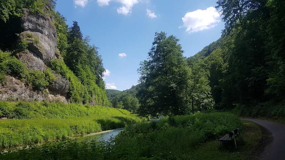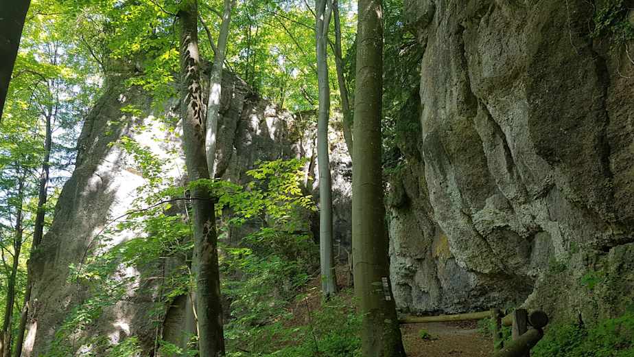 Ab dem Muggendorfer Naturpark-Infozentrum (= Bahnhofsgebäude) startet die Tour auf der Promenade im Ort - der Wiesent entlang Richtung Behringersmühle. Der erste Kilometer ist noch eben auf dem Talweg („Leo-Jobst-Weg“). Vorbei an einer Holzbrücke auf freier Flur wartet dann nach 300 m der erste Anstieg nach rechts – Richtung Wohlmannsgesees. Nach einer Spitzkehre geht’s weiter nach rechts hoch bis zum Waldlehrpfad und dann weiter hoch auf schmalem Pfad Richtung Wohlmannsgesees hinauf zur Jurahochfläche. Oben angekommen vor dem Ort gleich nach links und mit der Markierung „Rote Raute“ Richtung Burggaillenreuth. Durch den Wald führt ein schmaler Pfad bis zu einem Forstweg – diesen kreuzen und weiter der „Roten Raute“ folgen - nun wieder auf einem schmalen Waldpfad, vorbei an Felsen, in leichtem Auf-und-Ab bis zur Verbindungsstraße Windischgaillenreuth - Burggaillenreuth. Vor dieser, unmittelbar nach Verlassen des Waldpfades, nach links auf dem Forstweg wieder hinunter ins Tal. Dieser Forstweg trifft nach 500 m Abstieg wieder auf den Wiesenttal-Talweg – auf diesem ist für weitere 400 m Richtung Behringersmühle etwas Ausruhen möglich, bis zum nächsten Anstieg ab dem Bahnhaltepunkt Burggaillenreuth. Auf dem Kiesweg mit mittlerer Steigung geht es nun wieder bergan zum „Hintereingang“ der Burg Gaillenreuth. Noch vor Ortsbeginn zweigt ein schmaler Pfad Richtung „Keltenwall“ ab.