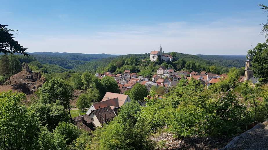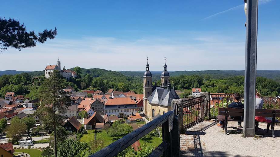 Gut 50 m die Gartenstraße hoch bis zum Rundweg, der als Kreuzweg einen Bogen bis zum Kreuzberg schlägt. Auf diesem bis zur Aussichtskanzel – kurz vorher geht’s runter, direkt zur hinteren Seite der Basilika. Von dort hinüber zum Friedhof queren, der an der südöstlichen Seite auf dem bezeichneten Wanderpfad umgangen wird. Nach ein paar Kurven durch ein kleines Wäldchen gelangt man zur Balthasar-Neumann-Straße, die, genau wie der Spielplatz gegenüber, gequert wird, um in einem S-Bogen Richtung Ortsausgang (Behringersmühler Str.) zur Staatsstraße St2185 zu gelangen, die überquert wird – am Höhen-Freibad vorbei dem Wanderweg Richtung Tüchersfeld / Pottenstein folgen.