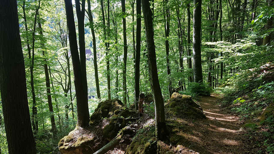 Der Asphaltweg führt bis zu einer Pferdekoppel, dann nach 200 m auf dem Wanderpfad („Frankenweg“) nach links am Wiesenrain entlang und kurz darauf, links haltend auf schmalem Pfad in den Wald. Dieser Pfad führt in einem Halbbogen zum höchsten Punkt des Sieghardfelsen mit einem etwas versteckten Turm (leider ohne besondere Aussicht) und -dem Rundweg gegen den Uhrzeigersinn weiter folgend- wieder zurück nach Gößweinstein, vorbei an einem Camp mit Bogenschießanlage, bis wieder das Höhenschwimmbad auftaucht. Hier beginnt nun der Abstieg nach Behringersmühle – durch die „Brückneranlage“.