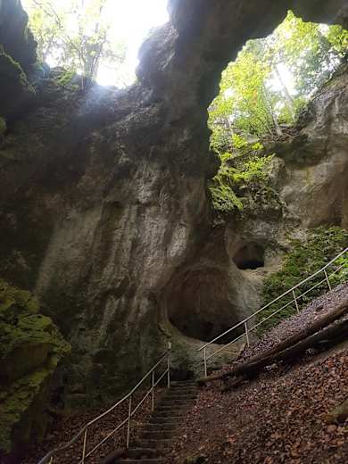 Westlich vom Hohen Kreuz geht es weiter auf dem Wiesenttal-Trail (bzw. auch Markierung „Frankenweg“) zur „Oswaldhöhle“. Wo der Pfad aus dem Wald kommt und der Blick sich ins Wiesenttal oberhalb von Muggendorf öffnet, nach links unten halten zu den Steinstufen, die direkt an den südöstlichen Eingang der „Oswaldhöhle“ führen. Diese wird durchquert (ein Handylicht ist ausreichend), danach die Höhe halten oberhalb von Muggendorf, das Sträßchen (von Muggendorf nach Engelhardsberg) queren und weiter den Pfad auf der anderen Straßenseite wieder hoch bis zum alten Muggendorfer Pavillon.