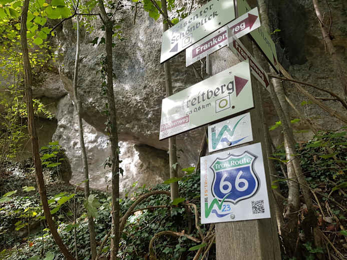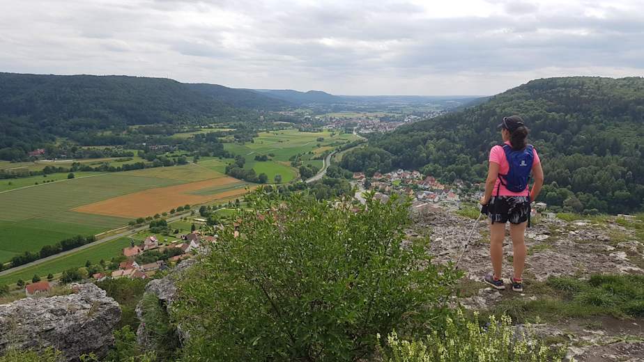 Die Trail.Route.66 ist die Ultra-Marathon-Runde der FS*TRailissimo Trailregion in der Fränkischen Schweiz. Zentrum, „Dreh- und Angelpunkt“ der Ultratrail-Runde ist Muggendorf, der größte Ort der Gemeinde Wiesenttal, mitten im Herz der Fränkischen Schweiz. In Summe ist die Tour 66 Kilometer lang. Wir teilen sie hier in zwei Teile - eine Ost- und eine Westschleife und stellen euch hier die Westschleife vor, die von Muggendorf über Streitberg nach Westen bis Ebermannstadt führt und wieder auf der südlichen Talseite, vorbei am Wahrzeichen der Region, der Burgruine Neideck, zurück nach Muggendorf leitet. Für mehr Übersicht sorgen wir zudem durch die Unterteilung in Abschnitte (für die Westschleife Abschnitte 7 - 17), die die Besonderheiten der Tour darstellen.