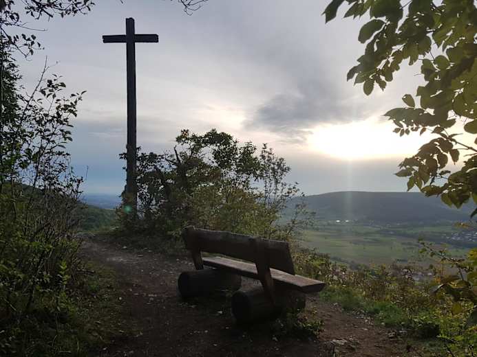 Nach dem Biohof geht es bald recht zügig auf dem Schotterweg hinunter – wieder ins Wiesenttal. An einer Infotafel zum Thema Wassertragen (vom Tal auf den Berg) beginnt nach rechts der Abstieg durch das Geotop Riesenburg. Über viele Steinstufen wird diese eindrucksvolle Versturzhöhle durchquert, bis man ganz unten auf der Staatsstraße St2191 an einer Parkbucht ankommt. Hier nach links (Richtung Doos) weiter an der linken Straßenseite bis zu einem unscheinbaren Pfad nach 100 m, der steil nach links hoch auf der gleichen Bergseite hinaufführt. Dies ist der alte „Brunnweg“, auf dem noch im letzten Jahrhundert Trinkwasser von der Quelle an der Wiesent hoch ins Dorf auf den Berg getragen werden musste. An der zuvor zitierten Infotafel schließt sich die Riesenburgschleife und für knapp 50 m geht es auf gleichem Weg wieder hoch, bis zum Abzweig zum Wiesenttal-Blick. Hier weiter ziemlich steil nach rechts hoch – erst über Stufen, dann über Wurzeln wird zügig der Aussichtspunkt mit schönem Blick ins Wiesenttal erreicht. Weiter nach links auf dem gut markierten Weg, kurz auf Schotterweg, dann wieder nach rechts auf Waldpfaden weiter hoch, wieder Richtung Engelhardsberg. Auf der Ortsstraße einmal rechts, dann gleich wieder links hinab zum nächsten Ziel, den Turm und Sendemast des Hohen Kreuzes bereits im Blick. Auf breitem Schotterweg, dann wieder in den Wald und zum Schluß ein steiler Anstieg auf Pflastersteinen – und das Hohe Kreuz ist erreicht.