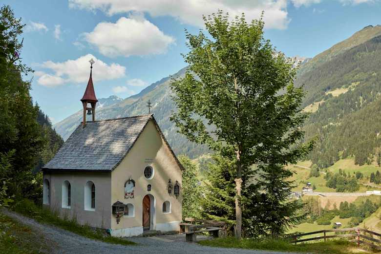 Von der Rotwegkapelle genießt man eine wunderschöne Aussicht ins Tal und auf den Ort Kappl.