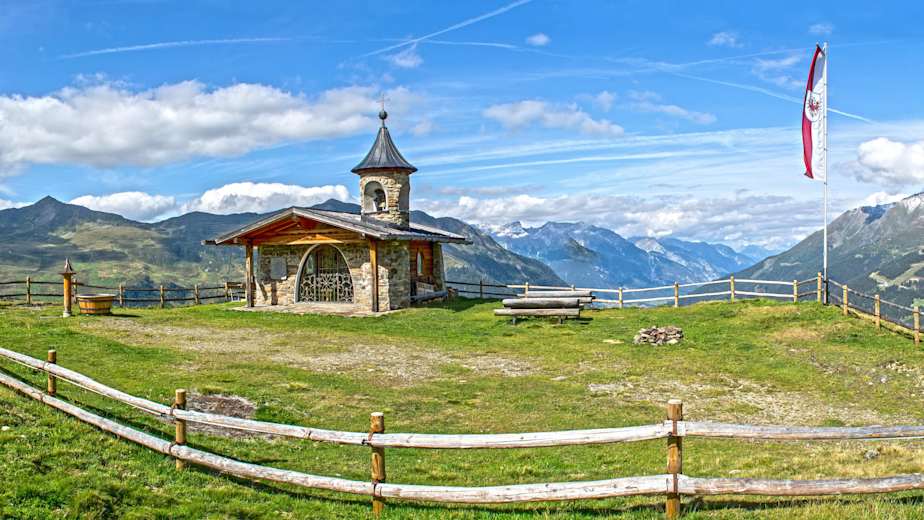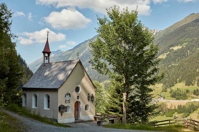 Der Weg führt weiter zur ausgesetzt gelegenen Kapelle und entlang des Almweges hinein ins Grübeletal bis zur „außeren“ Almhütte. Alternativ gelangt man in kurzes Stück weiter zum idyllischen Grübelesee. Nach der außeren Almhütte zweigt nach ca. 500 m der Fußsteig ins Tal ab, ein Holzsteg führt über den Grübelebach. Es geht talabwärts bis zum Forstweg und weiter Richtung Panoramaweg. Über eine Abzweigung gelangt man wieder auf den Forstweg, welcher vorbei an der Rotwegkapelle nach Kappl führt.