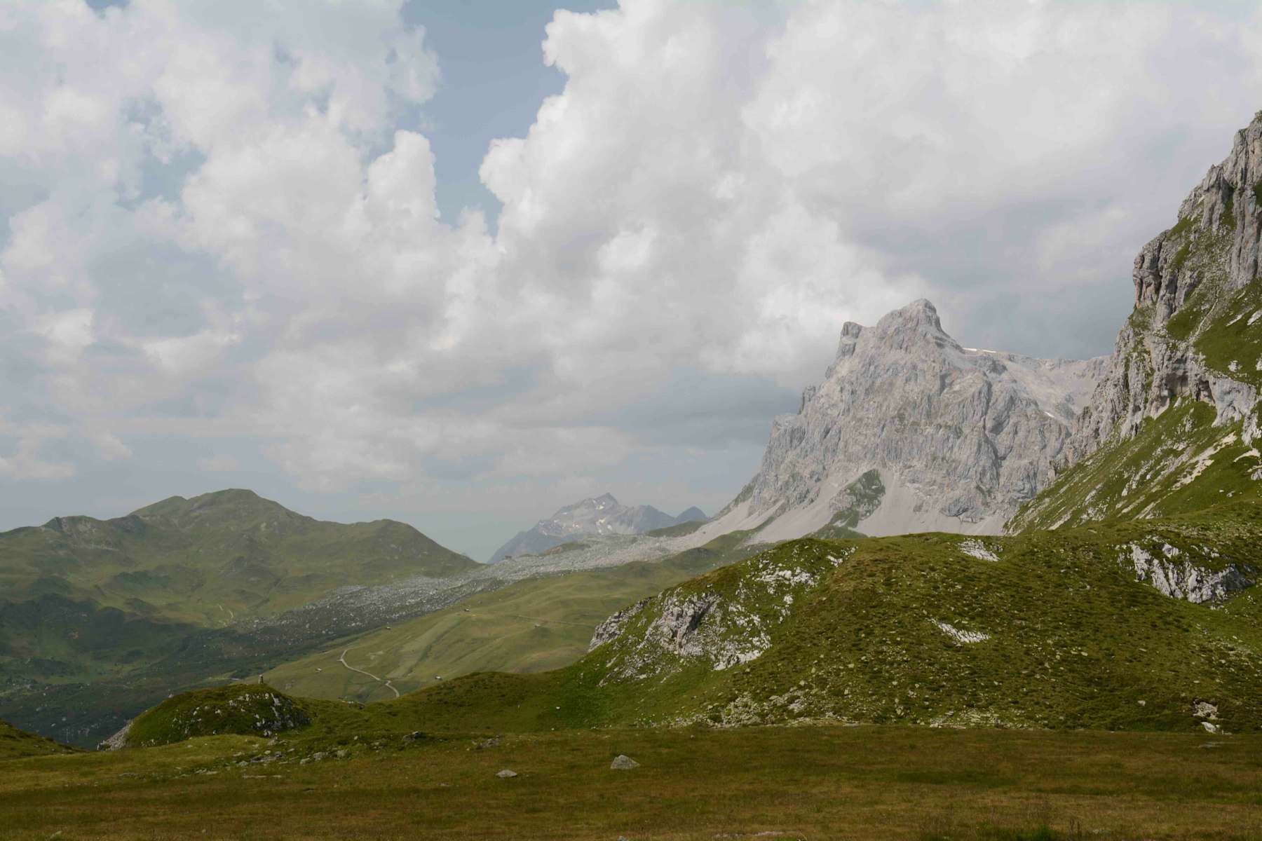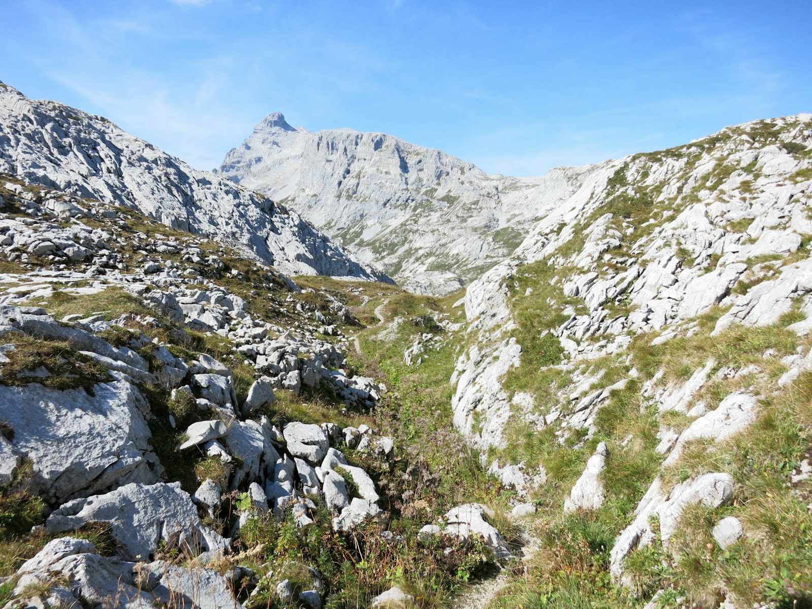 Mit dem Bus alpin bis Partnun. Zwischen den Kalkwänden der Sulzfluh (links) und Schijenflue (rechts) steigt der Pfad steigt zunächst sanft an. Vorbei am Partnunsee gelangt man nach dem Tritt (2.043 m) in eine karge, graufelsige Karrenlandschaft.