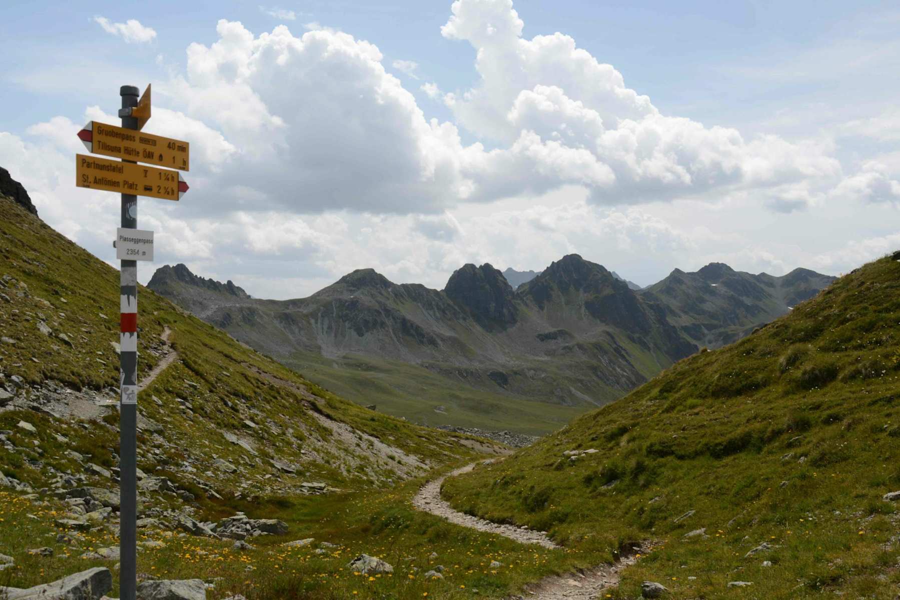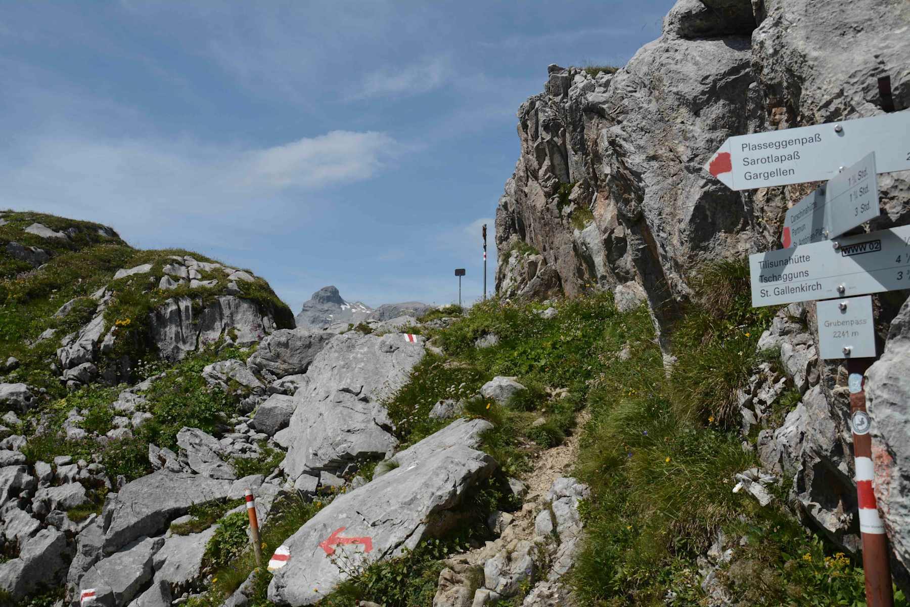 Vom Tilisunafürggli (2.219 m) schreitet man über grüne Hänge zur Tilisunahütte (2.208 m) hinab. Nun steigt man via den Gruobenpass, vorbei an der alten steinernen Zollhütte, zum Plasseggenpass (2.354 m) hinauf. Linkerhand begrenzen dunkle Bergspitzen das Hochtal, während rechts die Kalkfelsen hell aufleuchten. Sanft geht’s bergab, bevor ein kurzer steiler Zickzackweg durch eine Geröllhalde zur Weggabelung hinab führt. Unter den Felsen führt der Weg nach rechts, vorbei an der Weberlisch Höli, einem anspruchsvollen Klettergebiet.