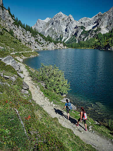 Entlang des Sees führt der Weg weiter bis zur etwa in der Mitte des Seeufers gelegenen Tappenkarseealm. Wer noch nicht genug hat, kann auch noch weiter zur Tappenkarseehütte gehen, die etwas oberhalb am anderen Ende des Sees liegt. Von beiden Almen aus, lässt sich bei einer guten Jausen der Ausblick auf den See und das Bergpanorama genießen, bevor es den gleichen Weg wieder zurück geht.