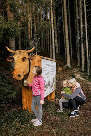 Von der Bergstation der Grafenbergbahn den markierten Spazier- und Wanderwegen folgen. Der KUHbidu Erlebnisweg ist bestens beschildert und auf insgesamt 7 Erlebnisstationen bekommen Kinder Antworten auf Fragen wie „Was frisst die Kuh?", „Wo kommt die Milch her?" und „Wie wird daraus Käse gemacht?"