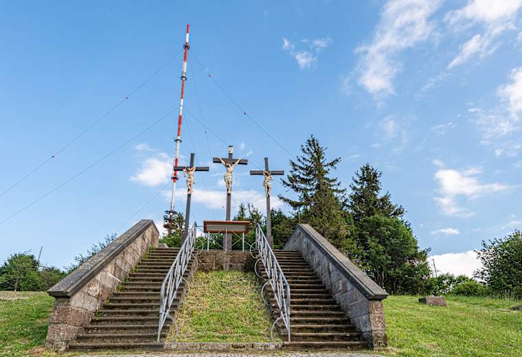 Man geht aus Langenleiten hinaus und sieht nach dem Sportplatz die Wiesen im Wald. Im Frühsommer blühen hier die Orchideen und man hat einen hervorragenden Blick auf den Kreuzberg. In Kurven geht es auf den Reidelberg und durch einen alten Fichtenwald bergab. Es folgt ein langer Anstieg auf den Kreuzberg – durch Wiesen, Buchenwald und ein kurzes Stück durch eine düstere Fichtenschonung. Am Kloster wird das Bier empfohlen, das unter Aufsicht der Franziskanermönche, seit Jahrhunderten gebraut wird. Eine fantastische Aussicht aus 928 Metern Höhe kann am Gipfel mit den drei Kreuzen genossen werden.