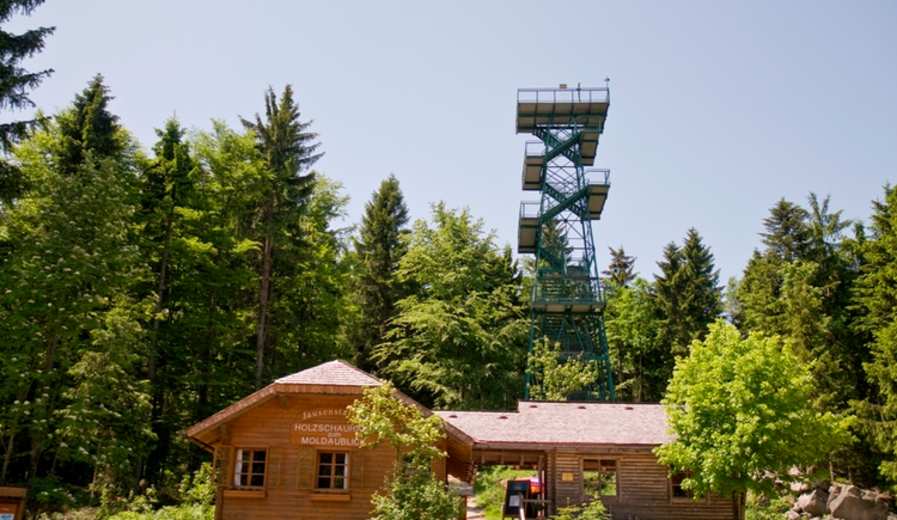 Halten Sie sich links auf der Forststraße und mäßig ansteigend führt Sie diese zur Aussichtsturm Moldaublick und dem Holzschauhaus. Folgen Sie ca. 1 km der Straße bis zur Abzweigung nach links. Auf dem Waldweg halten Sie sich rechts und folgen der Baummarkierung. Sie queren den Wald und erreichen die Jägerhütte (Schmidalm).