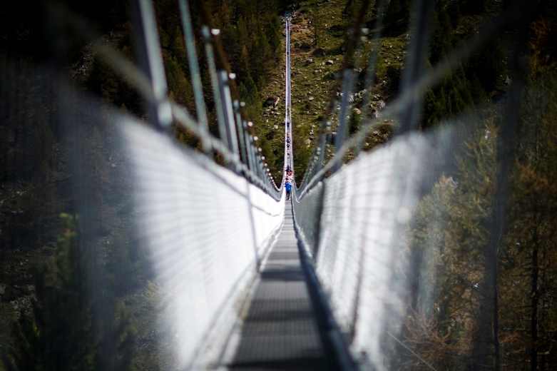 Wer sich etwas langsamer an das Thema „Hängebrücke“ herantasten möchte, kann zuerst einmal die Hängebrücke bei Furi oberhalb von Zermatt versuchen - sie hat eine Länge von 100 m und führt über die Gornerschlucht. An der höchsten Stelle ist sie 90 m hoch.