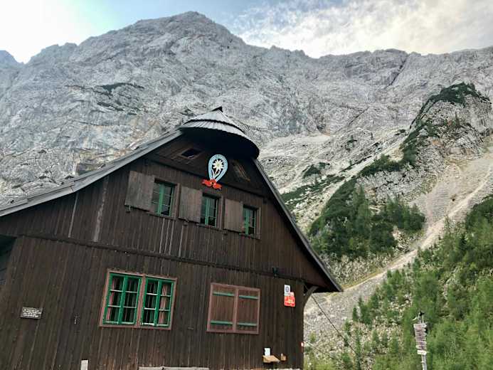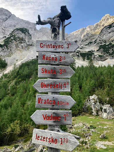 Der Abstieg erfolgt zum Mlinarsko sedlo (2.334 m) und von dort über einen etwas leichteren Klettersteig (B) durch die Nordwand zurück ins Kar. Von der Češka Koča kann man über einen anderen Steig als beim Aufstieg zurück zum Parkplatz gelangen.