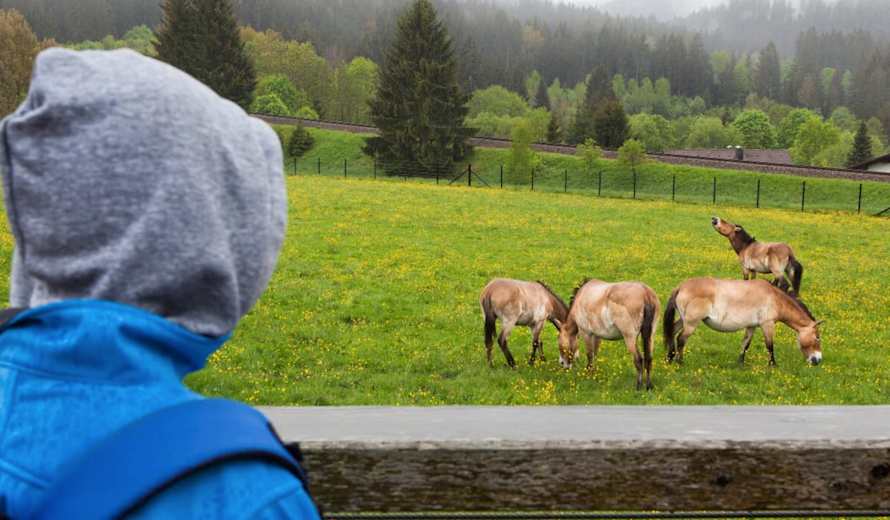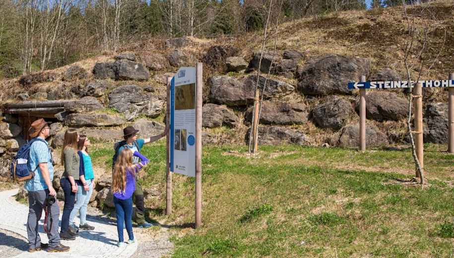 Vom Parkplatz aus wandern wir gerade aus durch die Bahnunterführung, dann rechts auf den ‚Rundgang Wildtiere' und durch das Tierfreigelände zur Steinzeithöhle.
