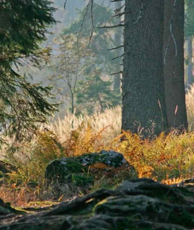 Direkt vor dem Haus zur Wildnis wechseln wir unsere Markierung und wandern mit der ‚Luchsfährte' in Richtung Zwieslerwaldhaus. Nach kurzer Zeit zweigt von dem Forstweg ein schmaler Pfad nach rechts ab. Diesem folgen wir länger durch den Mischwald. Nachdem der Pfad in einen Forstweg übergegangen ist passieren wir zunächst das Wildniscamp am Falkenstein, eine Umweltbildungseinrichtung des Nationalparks für Schulklassen. Weiter geradeaus erreichen wir schließlich den Ortseingang von Zwieslerwaldhaus (690 m ü. NN).