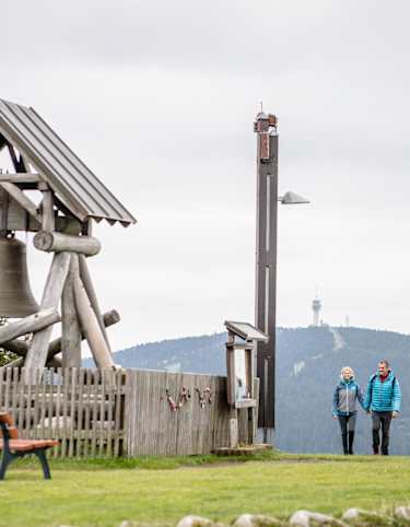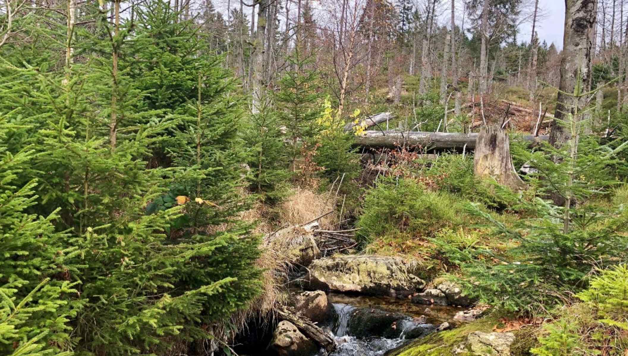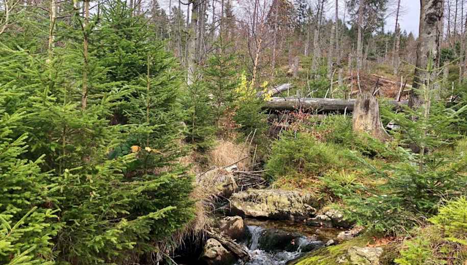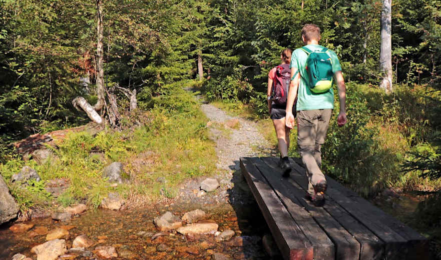 Danach wartet der erste merkliche Anstieg des Tages auf uns, der uns zur Schutzhütte Feistenberg führt. Dort angekommen folgen wir weiter dem 'Ahorn' nach rechts. Der Weg wird nun flacher, steigt erst kurz vor Erreichen des Rachelsees an einer Passage parallel zum rauschenden Seebach wieder an. Am ehemaligen Gletschersee angekommen genießen wir den Blick auf den Großen Rachel (1.453 Meter), machen uns dann aber in entgegengesetzte Richtung auf, die Felsenkanzel zu stürmen. Dafür folgen wir ab sofort den Markierungen 'Buntspecht', 'Goldsteig' und 'Grünes Dreieck'. Nach einem weiteren kurzen Anstieg haben wir an der Felsenkanzel den höchsten Punkt der Tour erreicht. Der folgende Abstieg bringt uns direkt zur Racheldiensthütte, wo im Sommerhalbjahr eine Einkehrmöglichkeit auf uns wartet.