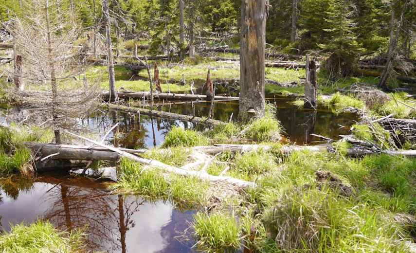 Wir starten am Parkplatz Wistlberg und steigen dort in den Bus ein. Nachdem wir die Igelbus-Haltestelle Schwellgraben (1100 m ü. NN) erreicht haben, beginnen wir unsere Wanderung mit der Markierung ,Baummarder´ nach links in Richtung Reschbachklause. Der Waldpfad zieht sich an einem alten Wassergraben entlang, bis er nach einiger Zeit über eine Holzbohlenbrücke den Reschbach kreuzt. Wir halten uns rechts und wandern leicht bergauf zur Reschbachklause. Zu unserer Rechten können wir frische Biberspuren erkennen.