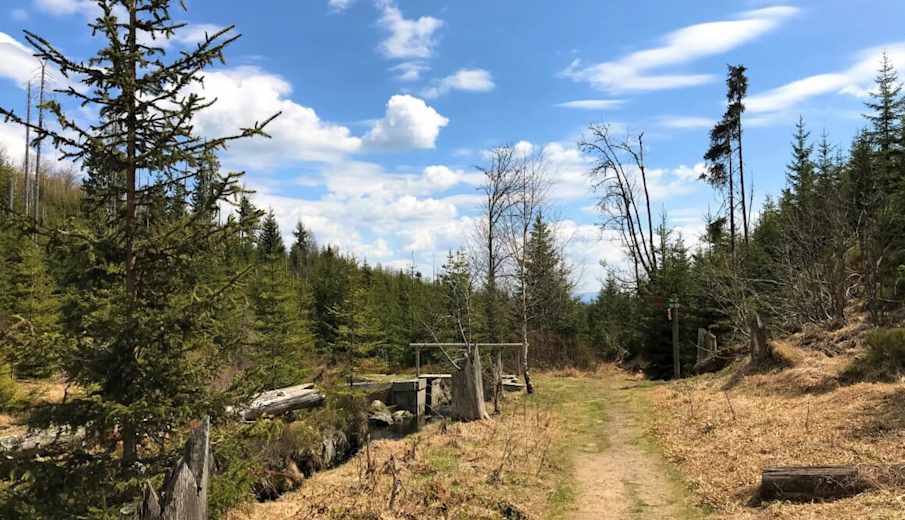 An der Reschbachklause angekommen (1130 m ü. NN) überqueren wir zunächst die Dammkrone. Dort lädt am Ufer der Klause eine Bank zu einer Rast ein. Für den Rückweg erholt wechseln wir die Markierung und folgen ab jetzt dem Radweg Richtung Finsterau. Der fast ebene Schotterweg bietet einen Panoramablick über die neu entstehende Waldwildnis im Nationalpark. Am Muckenloch treffen wir auf die Straße, die nach links zum Grenzübergang nach Tschechien führt. Wir biegen aber nach rechts ab und folgen der Straße bergab Richtung Finsterau. Schon bald sind wir an unserem Ausgangspunkt, der Igelbus-Haltestelle Schwellgraben, zurück. Dort steigen wir in den Bus ein, der uns wieder zum Parkplatz bringt.