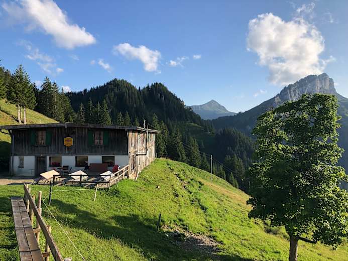 Nach einer Verschnaufpause gehen Sie entlang des Grates den gleichen Weg zurück. Kurz bevor der Weg wieder in den Wald hineinführt, steigen Sie auf der linken Seite mit einer kleinen Leiter über den Zaun. Von hier steigen Sie in einer Viertelstunde ab bis zur Alp Loegg. Unterwegs stossen Sie auf ein Bänkli, welches sich anbietet kurz anzuhalten und die Aussicht zu geniessen. Von der Alp Loegg wandern Sie über die Wiese in 20 Minuten mehr als 200 Höhenmeter hinunter zur Alp Chätterech. Von dort folgen Sie dem Wirtschaftsweg und steigen bis zur Alp Grund stetig ab. Von dort führt Sie der Weg ungefähr zwei Kilometer entlang der Grossen Entlen, davon die letzten dreihundert Meter auf einem Asphaltsträsschen. Über eine alte Fussgängerbrücke aus Holz überqueren Sie den Fluss und folgen einem ansteigenden Waldpfad. Auf der Höhe passieren Sie die Alp Brüderen mit ihrer kleinen Kapelle. Von hier führt Sie der Eremitenweg durch eine Ferienhaussiedlung bis hinunter zum Ausgangspunkt Gfellen.