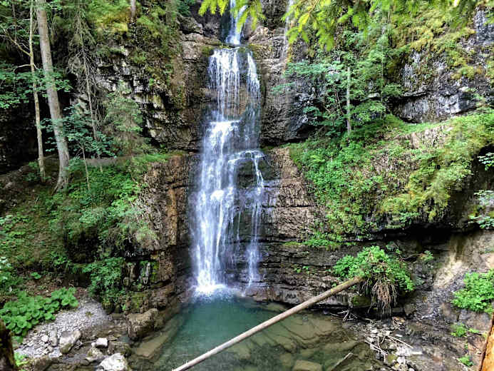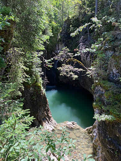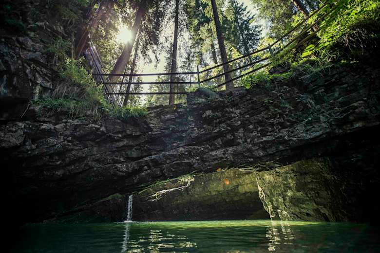 Die ersten Highlights dieser Wanderung lassen nicht lange auf sich warten. Schon nach wenigen Minuten erreicht man den Naturkneippbereich Kesselschwand und nur einige Meter später die Naturbrücke. Ein idyllisches Plätzchen, das mit seinem türkisenen Wasser und dem grünen Moos einen fast mystischen Charme ausstrahlt.
