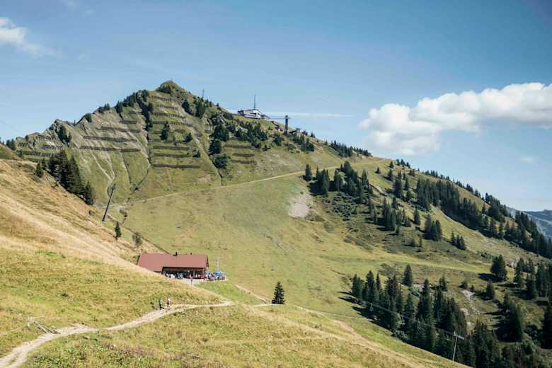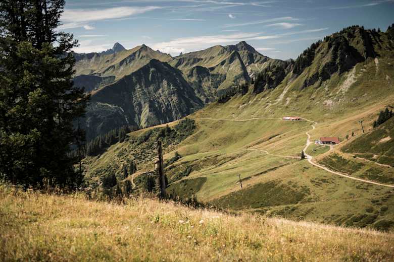 Von der Bergstation der Walmendingerhornbahn geht es über einen anfangs noch breiten Weg abwärts und später am Hang entlang zur Oberen Lüchlealp. Immer im Blick, der fantastische Ausblick auf die gegenüberliegenden Berggipfel. Nur wenig später führt der Weg "ums Eck". An der Weggabelung bietet es sich an, einen kleinen Abstecher zur Alpe Innerer Stierhof zu machen, wofür man sich links hält.