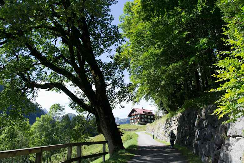 Von Mittelberg am Maisäßlift vorbei und auf dem Stützeweg bis zum Erlenboden. An der Weggabelung beim Gehöft den kurvigen Asphaltweg rechts hinauf und nach zwei Serpentinen nochmals rechts auf dem Haspelwaldweg in den Wald hinein (Schild 3 am Gatter). Durch das Waldstück, über die Lichtung mit der Pferdekoppel an mehreren Stationen vorbei bis zum Gasthof.
