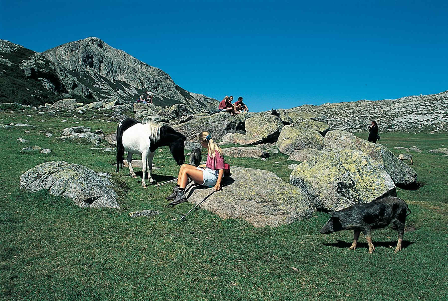 Die Ufer des Ninosees werden von frei weidenden Kühen, Schweinen und Pferden bevölkert. Im Hintergrund der Monte Rotondo (links). Foto: Annette Miehle-Wolfsperger und Klaus Wolfsperger, Rother Bergverlag Bildergalerie (3)