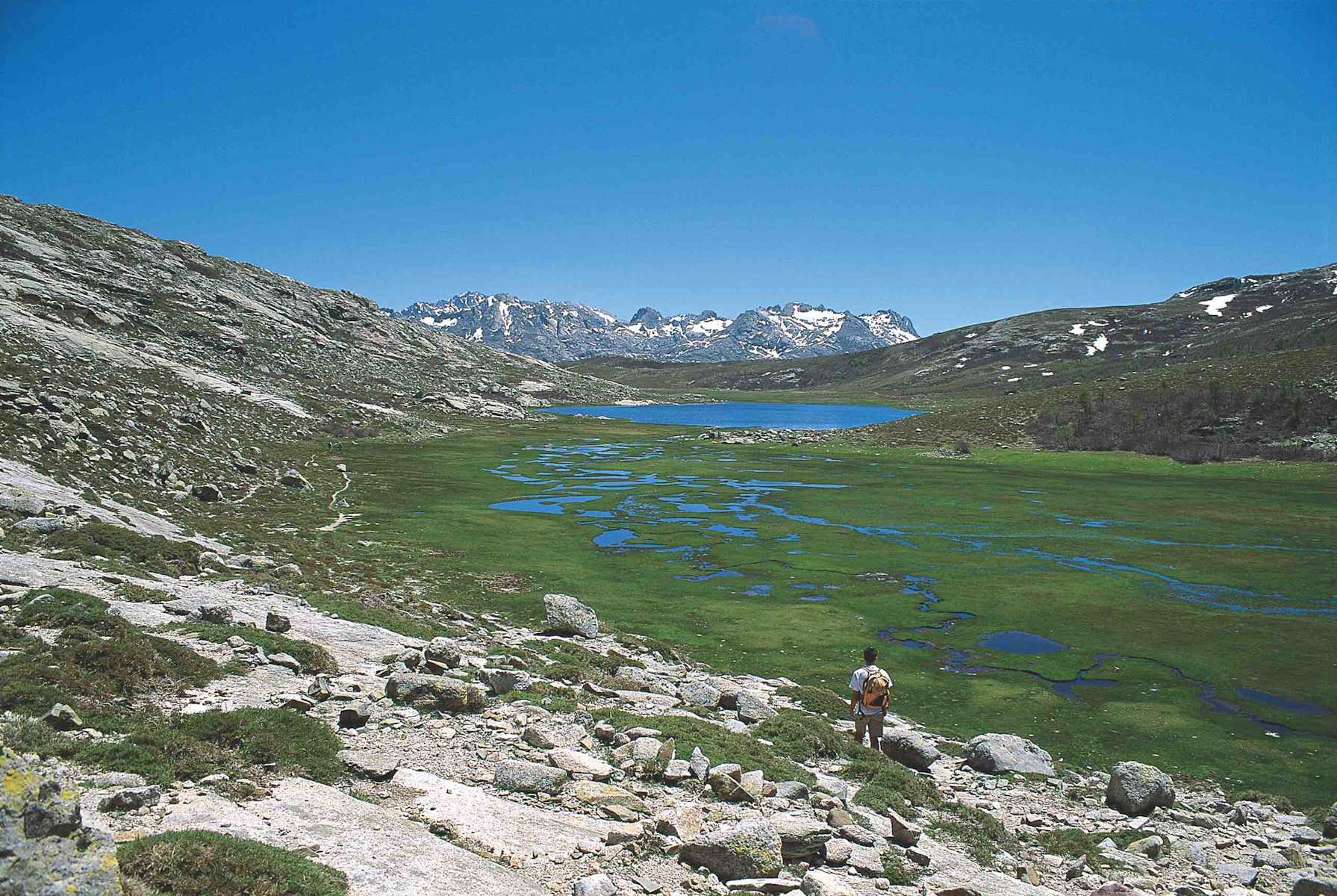 Es folgt ein anstrengender Aufstieg über Geröll und plattige Felspartien zum Bergsattel Bocca â Stazzona, 1.762 m (etwa 1¼ Std. von der Hütte). Hier können wir bei einer Verschnaufpause den Blick hinüber zum Cinto-Massiv und hinunter zu unserem Bergparadies genießen, bevor wir zum Lac de Nino, 1.743 m, hinabsteigen und es uns auf den (manchmal allzu) saftigen Wiesenmatten bequem machen (¼ Std. ab Sattel).